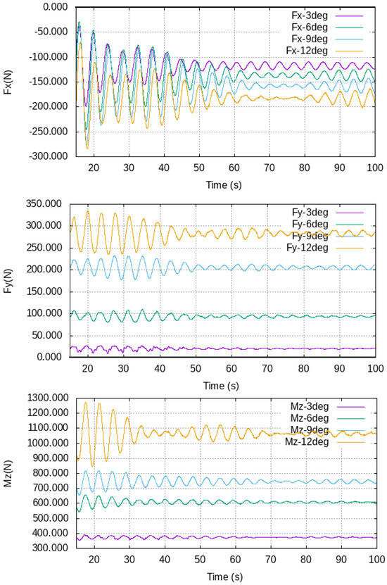 Time history for surge (Fx) and sway (Fy) forces and yaw moment (Mz) for varying drift angles at Fr 0.182, respectively, from top to bottom.