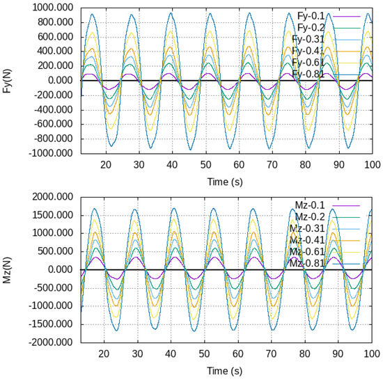 Time history for sway (Fy) force and yaw moment (Mz) at model-scale simulations, for varying sway rates at Fr 0.182.
