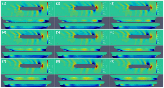 Hydrostatic pressure distribution on the free surface (around the hull) and on the starboard and port side of the hull (model-scale simulations) at sway rate 0.81 and Fr. 0.182. Images 1–9 show flow field visualization with time interval of 0.2 s.