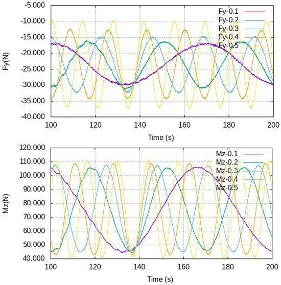In the case of yaw derivatives, Yr and Nr, F′y and M′z should be estimated at minimum yaw angle amplitude, and and , F′y and M′z should be estimated at maximum yaw angle amplitude [35]. Thus, for increasing yaw rates, lateral force and yaw moment data are collected at zero yaw angle, and for increasing yaw acceleration rates, lateral force and yaw moment are calculated at maximum yaw angle. The results are shown in Table 12. The results show almost linearly increasing coefficient values with increasing yaw rate.