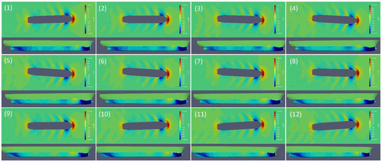 Hydrostatic pressure distribution on the free surface (around the hull) and on the starboard and port side of the hull (model-scale simulations) at yaw rate 0.50 and Fr. 0.182. Images 1–12 represent flow field visualization for yaw simulation at 1 s time interval.