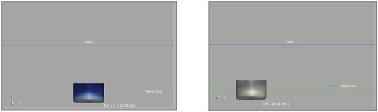 Inland waterways in Bangladesh come in different widths and depths depending on the location and season. Thus, vessels operate in both relatively open water and restricted water conditions. In this study, for restricted water simulations, a class III channel has been considered following the definition by the Bangladesh Inland Water Transport Authority (2023) [28]. The class III routes are feeder routes with regional importance. Such routes generally have a minimum vertical clearance of 7.62 m and a horizontal clearance of 30.48 m. For restricted water simulations, a similar configuration has been used.