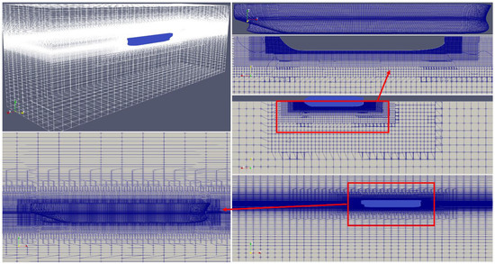 General mesh assembly used in model-scale open water simulations; mesh distribution on ship hull, in the x–y plane (free surface), and the y–z plane (vertical surface). Red boxes indicate zoomed images.