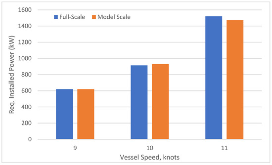 Relative comparison between the propulsion power predicted by extrapolated model-scale and full-scale simulation results for three-vessel speeds.