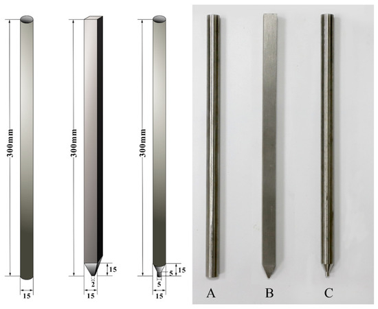 According to three traditional pile end shapes of precast piles, a prestressed pipe pile with a side length of Φ600 mm, a precast reinforced concrete square pile with a side length of 600 mm and a semi-closed-end steel pipe pile with a side length Φ600 mm were selected as prototypes, and reduced to small-size models with a ratio of 40:1. In the process of pile driving using a static load, whether the pile is hollow or not and whether the pile is open-ended or close-ended, there is little influence on the bearing characteristics [48]. Therefore, model piles with a solid structure are adopted to ensure the small-size model piles are rigid enough. The geometric shape and size of different model piles are shown in Figure 1. Among them, model pile A simulates the prestressed pipe pile, model pile B simulates the precast reinforced concrete square pile and model C simulates the semi-closed-end steel pipe pile.