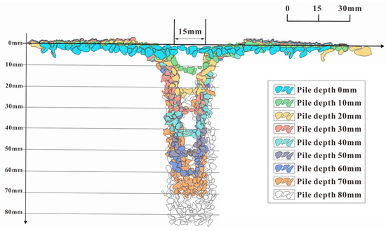 In terms of the particle breakage, using fixed-point photogrammetry, the changes in the calcareous sand foundation with different model piles under different pile depths are obtained, as shown in Figure 4. Representative in clearly showing the particle variation during pile driving, the changes in the calcareous sand particles near model pile A and on the surface at different pile depths are extracted, as shown in Figure 5. It can be found that with the increase in pile depth, the calcareous sand particles at the bottom of the pile tip undergo a cyclic process from thinning to densification and from a large particle size to a small particle size. When the pile depth is small (0~20 mm), the calcareous sand particles under the pile tip are continuously compacted, and the bearing capacity increases. After reaching a certain stress limit (pile depth at 20–40 mm), the calcareous sand particles under the pile tip are broken, resulting in more fine particles and a sparse arrangement. The energy dissipation and foundation bearing capacity decrease, which provides micro-evidence supporting the slight decline in the pile tip resistance of model pile A when the pile depth is 30–45 mm. When the pile depth is around 40–50 mm, with the re-compaction, the calcareous sand at the bottom of the pile tip reaches a much denser state, and the final bearing capacity increases. The position of the calcareous sand particles at the bottom of the pile tip changed significantly with a pile depth at 50~80 mm, and the flat calcareous sand particles on both sides of the pile gradually filled the gap between the pile shaft and the wall of the model box, resulting in the particle breakage not being obvious.