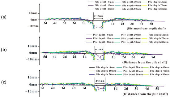 Based on the image obtained using fixed-point photography in front of the model box, Figure 6 shows the surface deformation of the calcareous sand foundation obtained using tracing and extraction in the process of pile driving with different model piles. With the continuous driving of model pile A (Figure 6a), a funnel-shaped groove is gradually formed on the surface of the calcareous sand foundation within the range of one pile diameter from the pile shaft, while the calcareous sand outside the funnel-shaped groove produces a slight extrusion uplift. Until a distance of five times the pile diameter from the pile shaft, the driving of the model pile hardly caused deformation on the surface of the calcareous sand foundation. However, model pile B is different from model pile A (Figure 6b). When the pile depth is relatively small (0~40 mm), the surface of the calcareous sand foundation near the pile produces an extrusion uplift; meanwhile, when the pile depth is relatively large (50–80 mm), the uplifts close to both sides of the pile body gradually move outward, and a small funnel-shaped groove is formed within one of the pile diameter from the pile shaft, but the groove depth does not change significantly with the pile depth. The surface displacement of model pile C (Figure 6c) is also similar to that of model pile A, but the depth of the funnel-shaped groove is the smallest among the different model piles.
