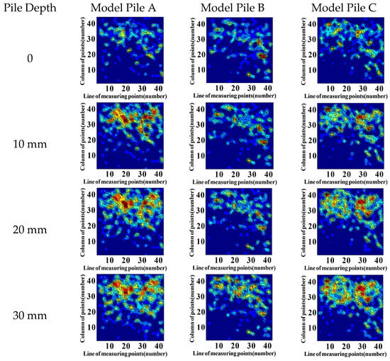 In terms of the contact force between particles, the vertical stress distribution in the calcareous sand foundation at 10 mm below the pile tip at the maximum driving depth is measured using the tactile pressure sensor. The distributions of and changes in the vertical stress generated by different model piles in the calcareous sand foundation during the driving process are shown in Figure 7. It can be seen that during pile driving, the stress distribution in the calcareous sand foundation is not uniform, whereas the influence range of pile driving is limited, and, further, the stress concentration is mainly generated in the range of about double the pile diameter around the pile. When the pile depth reaches 60 mm, an obvious stress concentration zone is formed in the calcareous sand foundation under the center of the pile. The vertical stress distribution of model pile B and model pile C at different pile depths is more uniform than that of model pile A, and their stress concentration zone is relatively less obvious.