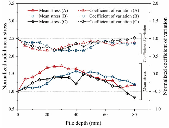 The macro-behavior is highly related to the micro-information. The underlying mechanism of different pile type effects in the calcareous sand foundation can be explored according to the internal stress obtained using the tactile pressure sensors. The mean stress and coefficient of variation in stress are used to characterize the stress distribution, in which the coefficient of variation is the ratio of standard deviation to the mean value, ranging from 0 to 1. The smaller the coefficient of variation, the smaller the dispersion degree of the data and the more concentrated it is in a smaller range. And the data processing method of normalization is used: the data before the test (i.e., the pile depth is 0 mm) are taken as the initial value, then the normalized data are the ratio between the data and the initial value.