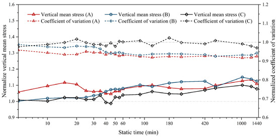 After the pile was driven to the target depth, the external force on the model pile was removed. That is, the buried depth of the model pile was kept at the designed pile depth of 80 mm for 24 h to develop the setup process, and the change in the stress distribution in the calcareous sand foundation was monitored. It is found that the global stress distribution changes a little with some local changes. The clear variations in the normalized vertical mean stress and coefficient of variation for different model piles along with increasing time are shown in Figure 10. It can be seen that the coefficient of variation in vertical stress decreases and the vertical mean stress increases after 24 h only under gravity. In other words, stress redistribution occurs in the calcareous sand foundation over time, and it tends to be more uniform, which induces a slight increase in its bearing capacity.