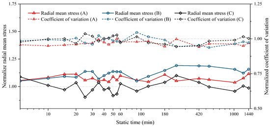 The variations in radial mean stress and coefficient of variation with time.