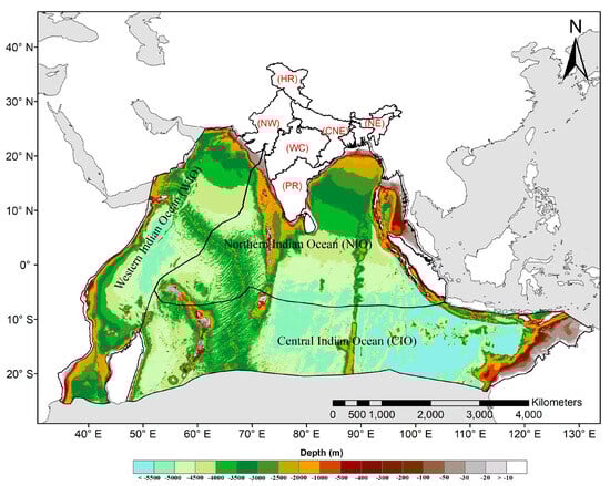 This study was carried out over the Tropical Indian Ocean, which is characterized by three major basins, namely, the western Indian Ocean (WIO), central Indian Ocean (CIO), and northern Indian Ocean (NIO), respectively (Figure 1). This division is based on the observed spatial distribution of average seasonal SST during the summer monsoon period [57]. The bathymetry profile of ocean basins depicted the depths of ocean beds (in meters). This was retrieved from the GEBCO gridded bathymetry data at the British Oceanographic Data Centre (BODC) (https://www.gebco.net/data_and_products/gridded_bathymetry_data/) (accessed on 16 October 2023). The Indian Ocean shares its land boundary on three sides with the Indian landmass. India is a mega-diverse country that spans its latitudinal boundary from 8–38° N and longitudinal boundary 66–100° E (more than 44% area is agricultural land). Based on the IMD homogenous precipitation zones, the entire country is classified into six zones, namely, the Himalayan Region (HR), northeast (NE), northwest (NW), central northeast (CNE), west-central (WC), and the Peninsular region (PR), respectively.