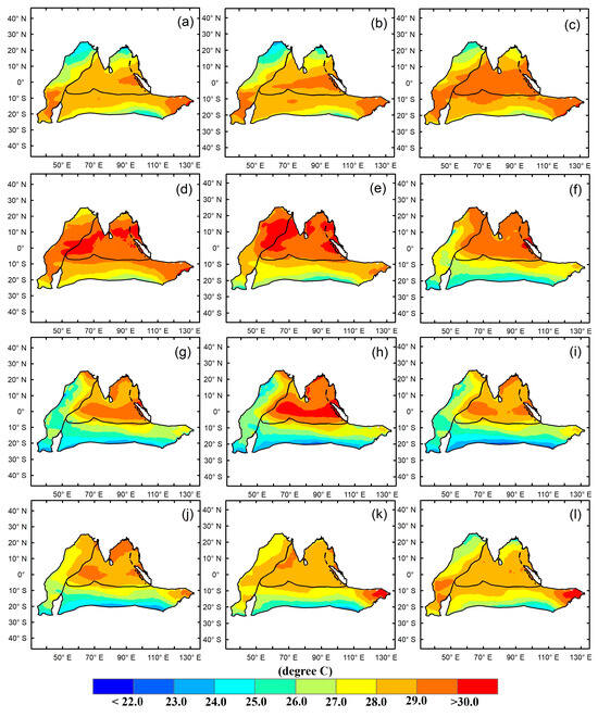 The long-term annual cycle from January to December (a–l) of SST continuous from 2001 to 2022.