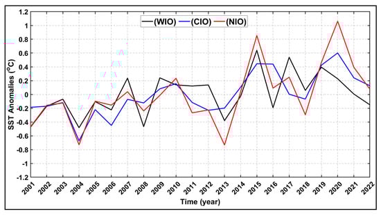 Temporal variations in average SST anomalies in the WIO, CIO, and NIO during the monsoon period (June–September) from 2001 to 2022.