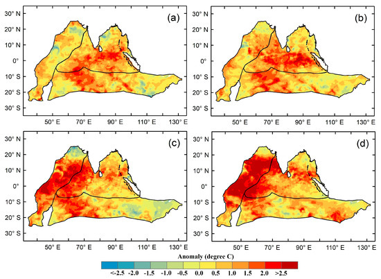 Similarly, for the WIO, the warming (maximum) trend crossed 0.6 and cooling reached (minimum) −0.5 °C throughout the adapted period. Moreover, the maximum and minimum values reached 0.6 °C and −0.7 °C of the CIO throughout the adapted period. The increase in SST anomalies over the tropical Indian Ocean has a linkage with climate change and global warming [92].