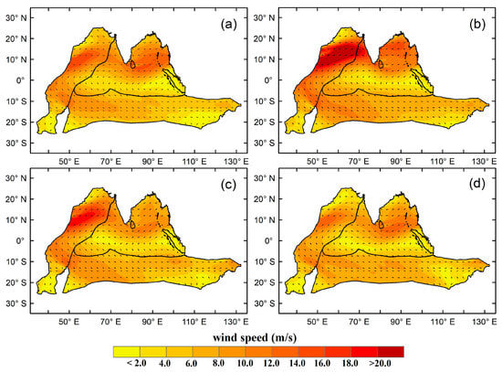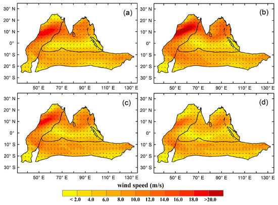 Wind speed and direction in the WIO, CIO, and NIO for (a) June, (b) July, (c) August and (d) September during 2009 El Niño event.