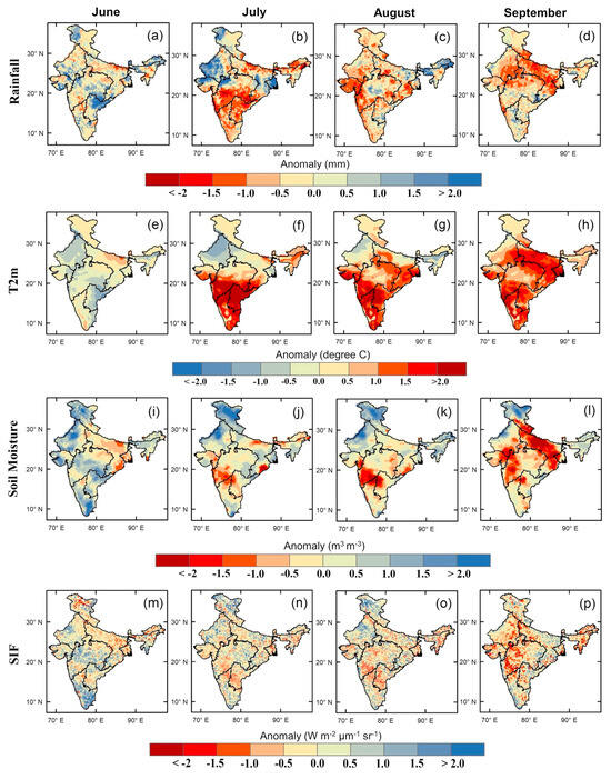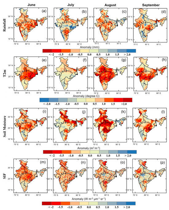 Spatial variation in rainfall (a–d), T2m (e–h), soil moisture (i–l), and SIF (m–p) anomalies for monsoon season (June–September) in the 2015 drought year.