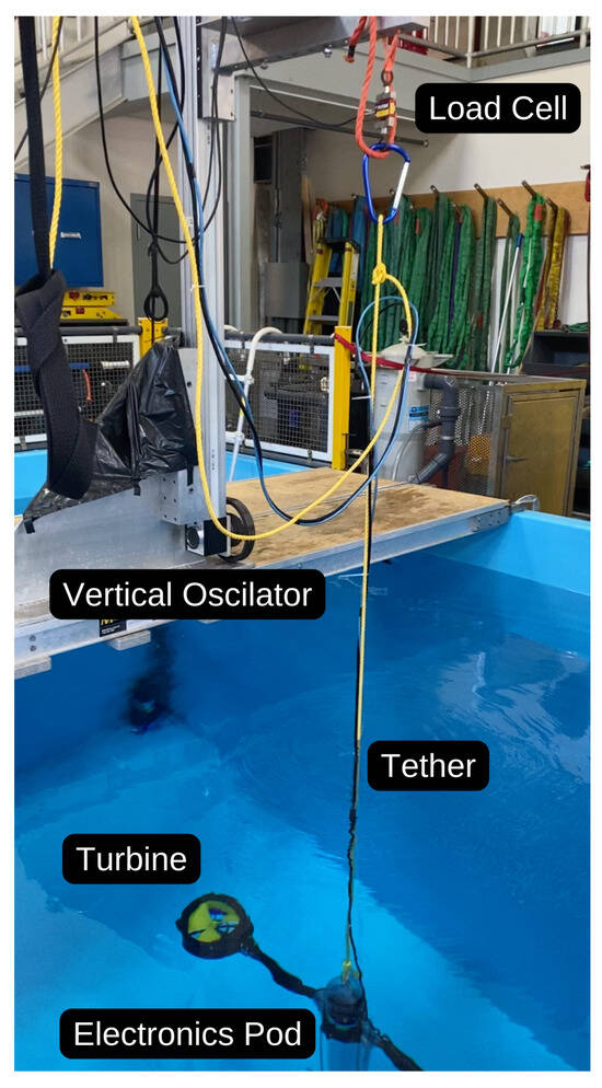 We conducted tank tests to validate our mathematical model, explore the design space related to system resonance, and show the feasibility of generating power and control from the oscillating turbines on an elastic tether. For the tests, a prototype pod was suspended in a vertical test tank and oscillated using a custom-built testing apparatus (