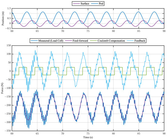 15) and force measured by the load cell was satisfactory; however, the first mechanical mode of the apparatus was sufficiently low in frequency that we were unable to completely eliminate exciting this mode without also compromising tracking performance. Attenuating control action at frequencies above the virtual surface wave frequency was effective at preventing the amplification of these oscillations and potential system instability. The impact on the turbine performance measurements is small; the oscillations in force are small relative to the virtual spring forces and are further attenuated in the pod’s velocity.
