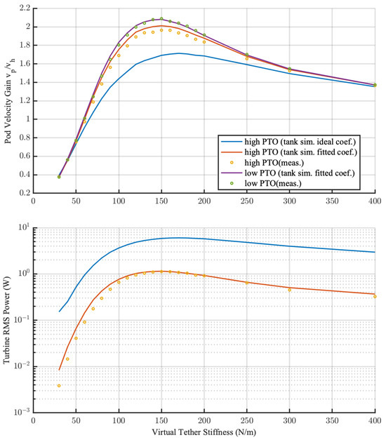 All tests used the same prototype, and the virtual surface input was a consistent monochromatic spectrum. Wave amplitude was limited by the height of the tank and amplitude gain at resonance. The spectrum had wave height and period corresponding to the wave energy period and significant wave height of a PM spectrum at a wind speed of 4 and a theoretical wave power of 235 . Using the PTO duty cycles, tests were performed with the turbines at maximum and minimum (free-wheeling) resistance. For each configuration, we tested the prototype across a range of virtual tether stiffnesses, representing designs with different natural frequencies including values significantly above and below the forcing frequency.