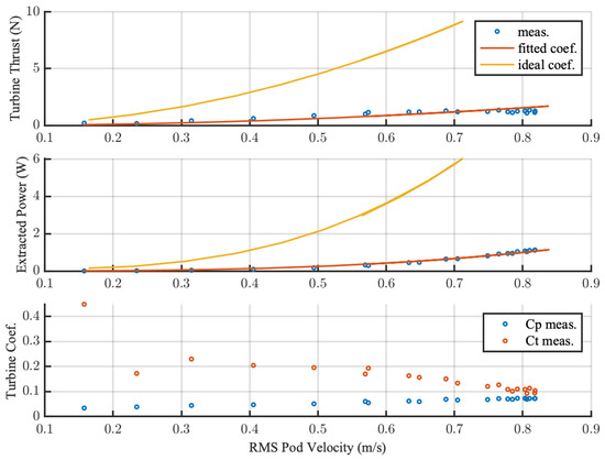 Figure 10 shows the RMS values for measured and ideal turbine thrust and extracted power as a function of the pod RMS velocity and the fitted coefficients for power and thrust. Across the measured pod RMS velocities, the coefficient values are within a factor of two except for two outliers in the thrust coefficient at low velocities.