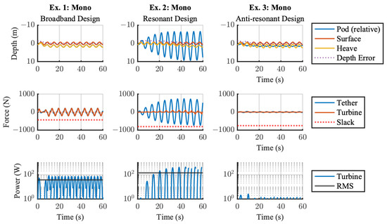 In the resonant example, the pod oscillates ~90 out of phase with the heave-plate and at a much greater magnitude. The heave-plate is closely matched to the surface wave oscillations, but the device is able to reach and stay near the control depth. Tether force is much greater than turbine resistive thrust and not significantly affected by control signal changes. Additionally, the tether compliance allows for significantly larger waves without slacking. The resonant design relies on small turbines and a large ballast allowing good power generation from large oscillations. The smaller turbines produce sufficient power and thrust through higher velocities. However, the influence of the controller is limited by the pod phase lag. As a result, the heave-plate oscillates around the control depth, and the turbine power extraction is set low for about half of the cycle.