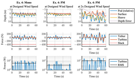 To evaluate a wider range of design parameters consisting of tether stiffness, pod mass, total turbine area, and heave-plate diameter, simulations were performed of the dynamic model (Equation (