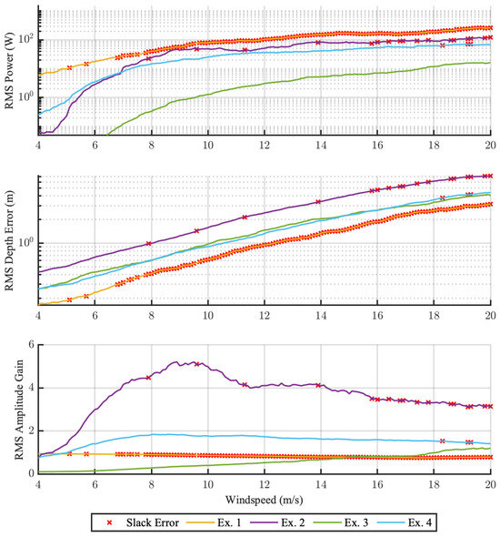 . However, at higher wind speeds, efficiency is less important due to the general increase in available wave power. The anti-resonant design (Ex. 3) performs worst at all wind speeds, and the broadband design (Ex. 1) experiences tether slacking even at relatively low wind speeds. The strongly (Ex. 2) and weakly (Ex. 4) resonant designs have similar performance at higher wind speeds with slacking remaining rare. However, at lower wind speeds, the weakly resonant design significantly outperforms the strongly resonant design for both power and control. For all four examples, depth error increases significantly with wind speed, potentially increasing the risk of a surface breach. This risk could be mitigated by setting a deeper control depth and relying on the greater depth penetration of wave power at higher wind speeds. The resonant and weakly resonant designs show heightened amplitude gain over the design wind speed.