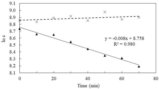 Halichondria panicea. Semi-ln plot of the reduction in algal concentration c (cells mL−1) (triangles) by a single-osculum sponge explant (Table 1). Linear regression function, its equation, and data (crosses) from a control experiment without sponge are shown.