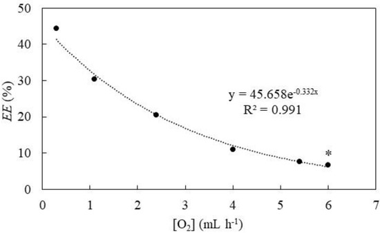 Halichondria panicea. Oxygen extraction efficiency (EE) of a single-osculum explant under stepwise reduced dissolved oxygen concentrations (O2) (Step #1 to #5) and after 24 h recovery from 0.3 mL O2 L−1 is indicated by *. Data from Table 2.