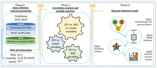 Specifically, after the preliminary data collection and pre-processing (Phase 0), the correlation analysis and variable selection (Phase 1) were carried out to reduce the complexity of the BN model by identifying high-correlated variables in three different settings: (i) correlation among selected variables; (ii) sub-matrix including SEV against its physical oceanographic drivers; (iii) sub-matrix including the SEV and water quality variables. Then, the development of the BN model (Phase 2) followed different steps, including (i) model design and parameterization; (ii) model validation; (iii) sensitivity analysis; and (iv) the baseline scenario analysis.