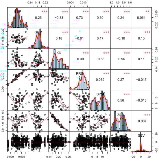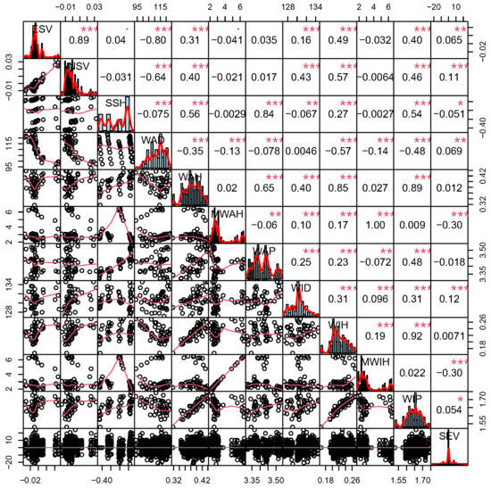 Correlation matrix focusing on the relation between shoreline evolution and oceanographic variables. The distribution of each variable is shown on the diagonal. Below the diagonal: the bivariate scatter plots with a fitted line are displayed. Above the diagonal: the value of the correlation and the significance level as stars: p-values (0, 0.001, 0.01, 0.05, 0.1, 1) and equivalent symbols (“***”, “**”, “*”, “.”, “ ”).