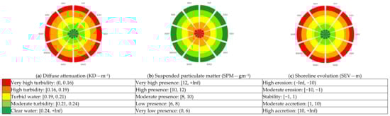 Sensitivity analysis was performed to provide information on the sensitivity of the assessment endpoints (i.e., SEV, SPM, and KD) to changes in the explanatory variables and to identify the most influential variables on the BN model output. Therefore, analysis of each explanatory node was performed one by one, by setting the probability of its highest state to 100%, while all other nodes remained constant. Accordingly, the relative change in the posterior probability of each assessment endpoint was analyzed and compared among configurations by changing the probability of one variable at a time. Figure 7 shows the probability of the states of all assessment endpoints in comparison to the prior probability (PrP). Within the rose charts, the green segments represent the probability of classification in the states of low turbidity for KD and SPM, with high turbidity highlighted in the red segments. In the case of SEV, the green segments correspond to shoreline accretion, the yellow segments represent a stable shoreline, and the red represents an eroding shoreline. Compared to the prior probability, notable changes in the classification probabilities in SEV were seen from the changes in the maximum significant wind wave height, where the probability of the high-erosion classes increased, indicating the highest increase in shoreline variability. In comparison, SPM was more influenced by changes in wave direction and wind wave direction. High values of KD were generally most influenced by seawater velocity values (ESV and NSV); however, changes in the posterior probability to KD were more subtle, indicating that, overall, the explanatory nodes made roughly similar contributions to the model output.