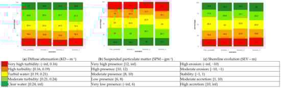 Third Scenario. The third scenario was aimed at evaluating the combination of the two most influencing extreme weather and oceanographic conditions affecting the investigated area, i.e., 100% probability of the highest classes of sea surface height (SSH) and maximum significant wave height (MWAH). As far as shoreline evolution is concerned, the results show that when storm waves reach critical height, small changes are observed in high- and moderate-erosion classes, with an increase of 3% and 4%, respectively. This result is balanced by a significant decrease of about 10% in the stable class, while the moderate and high accretion experienced slight changes (less than 2%). Regarding the water quality nodes, changes in SPM and KD are mostly countable (3% and 4%, respectively) for the highest and lowest classes, whereas moderate classes have almost negligible changes (less than 2%).