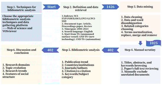 To offer more comprehensive insights into the advancement of cutting-edge technology in respect of USVs, this investigation conducted a systematic retrieval of scholarly articles focusing on USVs from the Web of Science (WoS) Core Collection database. Compared with other databases, WoS core database is more widely used and authoritative, and relevant published high-quality articles [,,,,] have adopted WoS as their supporting database. Through the application of bibliographic analysis, this research delineated the prominent areas of investigation and the methodologies employed in the exploration of subjects related to USVs. The research framework is graphically represented in Figure 1 for reference.