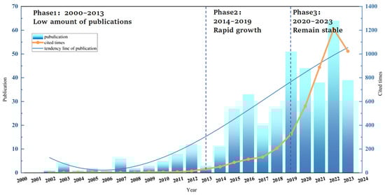 To obtain more insights into the concurrence of citations and publications, the time trends of publications in terms of publications and citations are also presented in Figure 4. The results show an overall increasing trend of research on USVs during the period from 2000 to 2023. This trend can be approximately divided into the following three stages: in (1) 2000–2013, the number of publications was minimal and increased slowly, producing fewer than 15 publications; in (2) 2014–2019, publications were driven by several special reports on USVs [] and commitments using some new methods [], and the research interest in considering USVs as promising auxiliary strategies had begun to increase. During this stage, the number of publications and citations increased from 11 to 57 and from 50 to 325, respectively; from (3) 2020–present, there is a stable stage in development, as the number of publications is always higher than the previous ones, along with a peak at 64 in 2022, during which time the average annual publication reached 40–60 documents. Note that the soaring increase in citations clearly demonstrates the concentrated focus in this field and forecasts the popular direction of USVs.