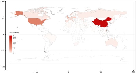 In terms of geographical distribution, a total of 55 countries and regions have participated in publishing 402 articles and reviews, while 30.9% of these countries contributed only one paper. Figure 7 illustrates the geographical distribution of publications from 2000 to 2023. The result shows that China took the lead with the largest number of publications at 177, followed by the United States with 68, England with 34, South Korea with 29 and Poland with 25.