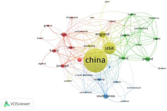 The international collaboration network reveals the presence of four primary clusters. Notably, China emerged as the most active collaborator, with the strongest link (10) established with England. It can also be inferred that Chinese researchers were currently responsible for the majority of document productions, as indicated by the color-coded data, and their collaborative network extended prominently at the international level. Additionally, note that a strong circle featured by the European region is shown in the red cluster, where Italy dominated the cooperative links in the red cluster, primarily conducting collaboration with England, Germany and Greece, along with some publications for a single time with other countries. South Korea and Poland took the privilege to engage in more contact with other countries in their clusters, respectively.