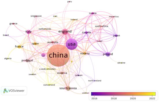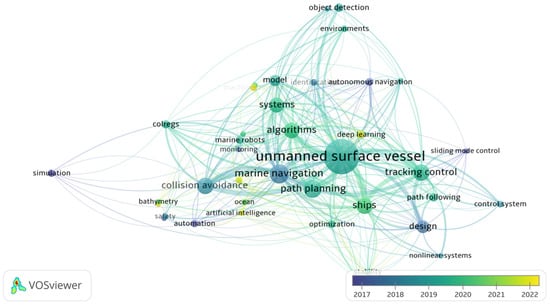 It is well known that close research collaborations between countries drive technological and research advancements. Figure 8 illustrates the collaborative relationship among countries by examining co-authorship patterns. It is worth noting that the substantial number of publications on the new technology of USVs originated from China, as there was significant international cooperation between China and other countries, indicating that the research in this field factually requires a particular international cooperation. The network was constructed by using the full-counting method, with a minimum threshold of two documents per country, leading to the inclusion of 35 countries in the analysis. To normalize the data, association strength was applied. The color-coded overlay represents the year of publication, and the thickness of the links is proportional to the overall strength of the collaborations.