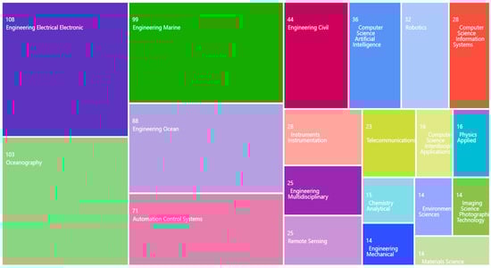 Within this interdisciplinary context, it is also intriguing to observe the presence of computer science disciplines among the top 10 most abundant categories. Disciplines such as “Engineering Electrical Electronic”, “Robotics”, “Computer Science Artificial Intelligence” and “Computer Science Information Systems” have secured their positions, underscoring the multifaceted and collaborative nature of new technology in USV research.