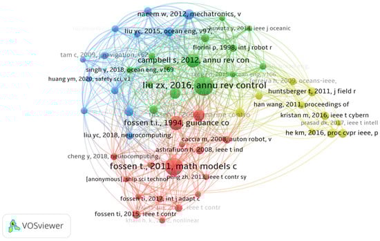 The red cluster is the largest, with 16 references, primarily dedicated to the marine model control and control system. Within this cluster, the work titled “Handbook of Marine Craft Hydrodynamics and Motion Control”, authored by Thor I. Fossen [] in 2011, emerged as the most frequently cited publication, with 26 citations, and exhibited the highest total link strength of 76, thus establishing its pivotal role as the central reference in this thematic cluster. The green cluster is the second largest cluster, with 14 references. This cluster emphasizes the overview of USVs, robot automation and visual remote sensing. The article “Unmanned surface vehicles: An overview of developments and challenges” by Zhixiang Liu [] in 2016 can be considered the core publication in this cluster, with the high citations (29) and total link strength (91), followed by the blue cluster with 12 references, primarily centered on the navigation and the neurocomputing application. Notably, the article titled “COLREGs-based collision avoidance strategies for unmanned surface vehicles”, authored by W. Naeem et al. [] in 2012, had the highest citation count at 13, and boasted the most substantial total link strength (78) within this cluster, thereby meriting recognition as the central reference shaping the discourse in this thematic group. Conversely, the smallest cluster, denoted by the color yellow and located at the right of the network, includes 10 references. The predominant themes in this cluster revolved around AI applications, such as deep learning, obstacle detection, object detection and autonomous visual perception. The article titled “Stereo Vision-Based Navigation for Autonomous Surface Vessels”, authored by Terry Huntsberger et al. [] in 2011, occupied the central position within this cluster, marked by the highest citation count of 11 and the most significant total link strength of 34.