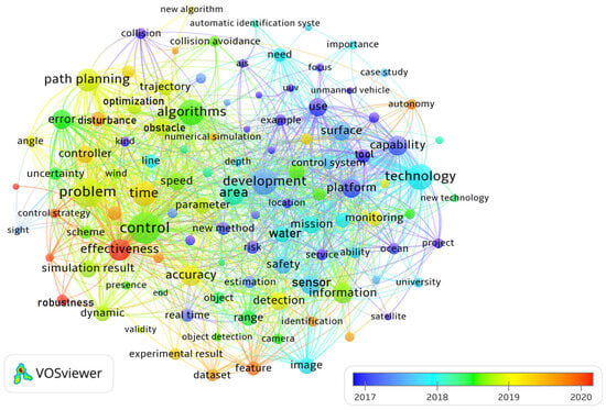 More specifically, the authors of the red cluster mainly collaborated on system approach and validations of USV. The yellow cluster was more focused on the motion framework and navigation planning algorithms of USVs, while the purple cluster shared the early perception and navigation methods of USVs. Additionally, the blue cluster conducted cooperation in tracking control and neuro-adaptive control, and the green cluster worked on the detection and identity of USV.