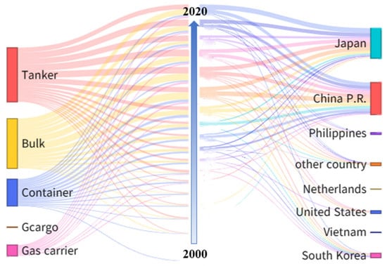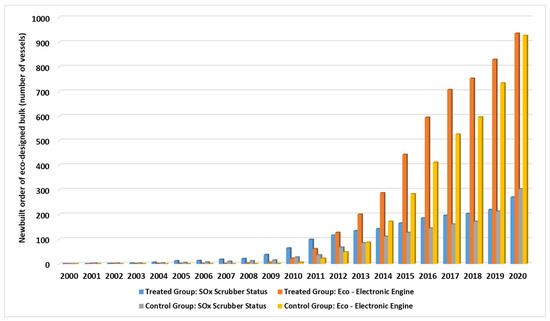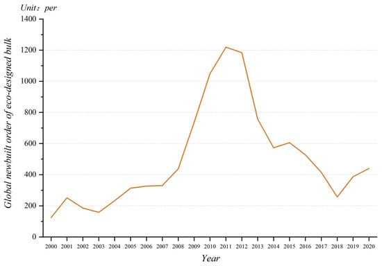 As global trade accelerates, emission reduction from shipping is urgently needed. From 2012 to 2018, sulfur emissions from shipping increased from 10.8 million tons to 11.4 million tons, accounting for 13% of global sulfur emissions [1,2]. The International Maritime Organization (IMO) announced that if left unchecked, sulfur emissions from the sea would increase by 140% in 2012, which would hinder the achievement of environmental sustainability goals [3,4,5]. At the end of 2020, the IMO issued short-term emission reduction recommendations for ships, which set out requirements in terms of both technical energy efficiency indicators and operational SOx and NOx intensity rating mechanisms, of which the global eco-designed bulk cargo newbuilding orders for the period of 2000–2020 are shown in Figure 1.