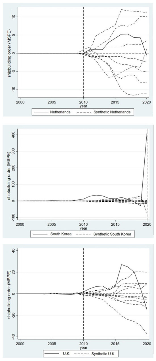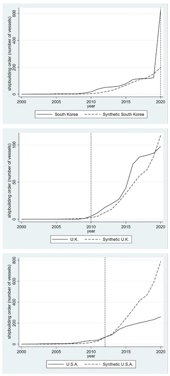 However, the above-mentioned scholars used regression models to conduct empirical analyses to examine whether ECA could improve the marine environment and how ship efficiency affects emissions. Based on annual shipbuilding data, the synthetic control method is used to quantify the effect of ECA on environmentally friendly ship construction. This study aims to provide recommendations for policymakers by examining the effects of ECA policy on environmentally friendly ship orders. The novelty of our research can be summarized as follows. Starting from the most recent data, the effects of ECAs on ship construction via the synthetic control method is quantified, which allows for the analysis of individual countries and further explores the effects of ECA policies in different countries. Next, the robustness of the synthetic control method via a placebo test and the difference-in-difference method is validated. In addition, the effects of ECAs are explored from the perspectives of shipowners and shipbuilders using textual analysis methods. Finally, our findings can explore the diversity of shipbuilding policies, as well as provide managerial and practical insights for the shipbuilding industry.