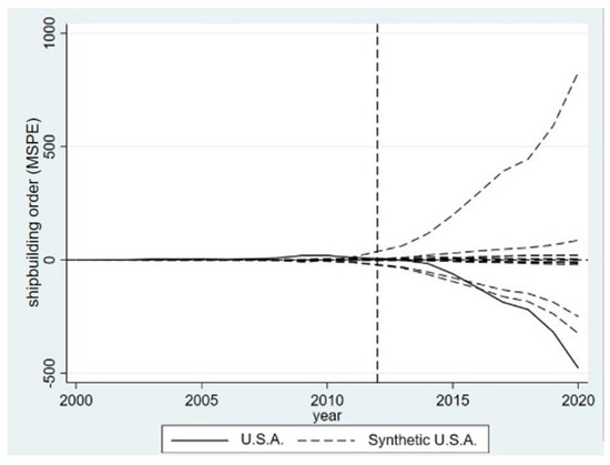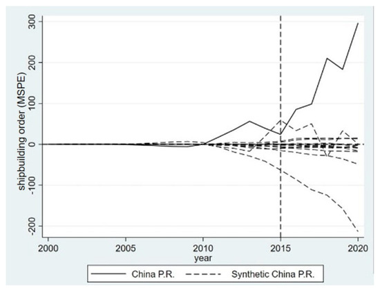 As shown in Figure 5, we present the placebo test results for estimating the impact of pseudo-interventions from the date of implementation of emission-control areas in each region. Here, the solid lines mean the difference between the five regions and their synthetic effect, whereas the solid lines represent the differences in the cumulative shipbuilding orders for eco-designed ships. Obviously, it can be seen that the MSPE (mean-square pure error) fluctuation between the treatment and control group countries before the policy occurred is insignificant, indicating that the treatment and control groups had similar development trends before the policy occurred, which ensures the placebo test is effective in validating the robustness of the results of the synthetic control method. Intuitively speaking, the curves of the treatment group and synthesis group show a similar trend and a stable trend before and after the expected pseudo-intervention in China and Republic of Korea. In addition, the results of the two exclusion regions correspond to the incomplete synthesis group in Figure 4.