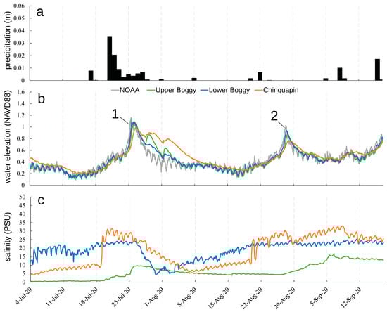 Precipitation (a), water elevation (b), and salinity (c) as obtained from the LCRA rain gauge (a) and the deployed CTDs (b,c). The water elevation is in NAVD88 m. The salinity is in practical salinity units (PSUs), which is similar to a parts per thousand (ppt) measurement. The named tropical cyclones that occurred during the study period and the resulting peak water elevation are indicated as Hurricane Hanna (1) and Hurricane Laura (2).
