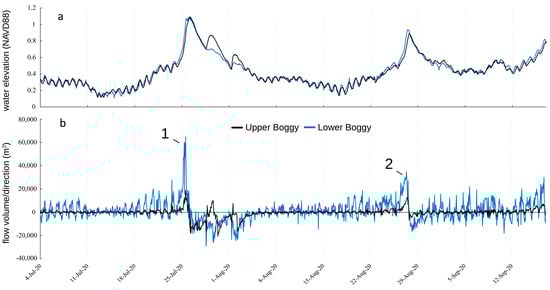 Water elevation (a) and flow volume/direction (b) measured by the ADCPs at the Upper and Lower Boggy stations. The positive values indicate upstream flows, and the negative values indicate downstream flows. Hurricane Hanna (1) and Hurricane Laura (2) were captured by the ADCPs and are indicated at their respective peak upstream flow volumes.