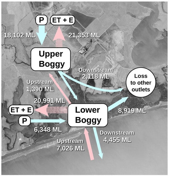 At the LB station, the total upstream flow during the study period was 7026 ML, consisting of incoming tides and storm surges. The total downstream flow measured 4455 ML, consisting of outgoing tides and freshwater flows. This flow pattern resulted in a net upstream flow of 2571 ML. Due to the much larger proportional area of wetlands and surface water, the combined ET and E greatly outweighed P at a volume of 20,991 ML to 6348 ML, respectively.
