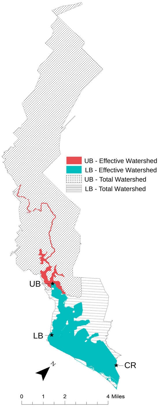 The Big Boggy Creek watershed delineated into four sections: the Upper Boggy (UB) effective watershed, the Lower Boggy (LB) effective watershed, the UB total watershed, and the LB total watershed. The black stars depict the sensor locations for Upper Boggy (UB), Lower Boggy (LB), and Chinquapin Road (CR).