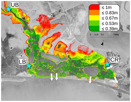 Alternate outlets for flowing water (white arrows) and water elevations needed to flood portions of the watershed (NAVD88 m). The Upper Boggy (UB), Lower Boggy (LB), and Chinquapin Road (CR) sites are depicted as blue stars.
